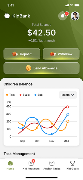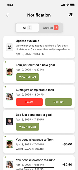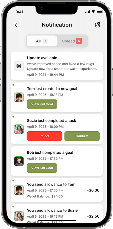 Stay informed with real-time notifications on allowances, tasks, savings, and activity.