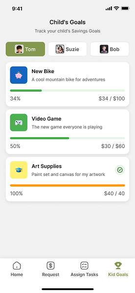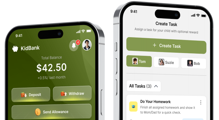 Kids complete tasks, earn allowance, set savings goals, and learn through interactive content.